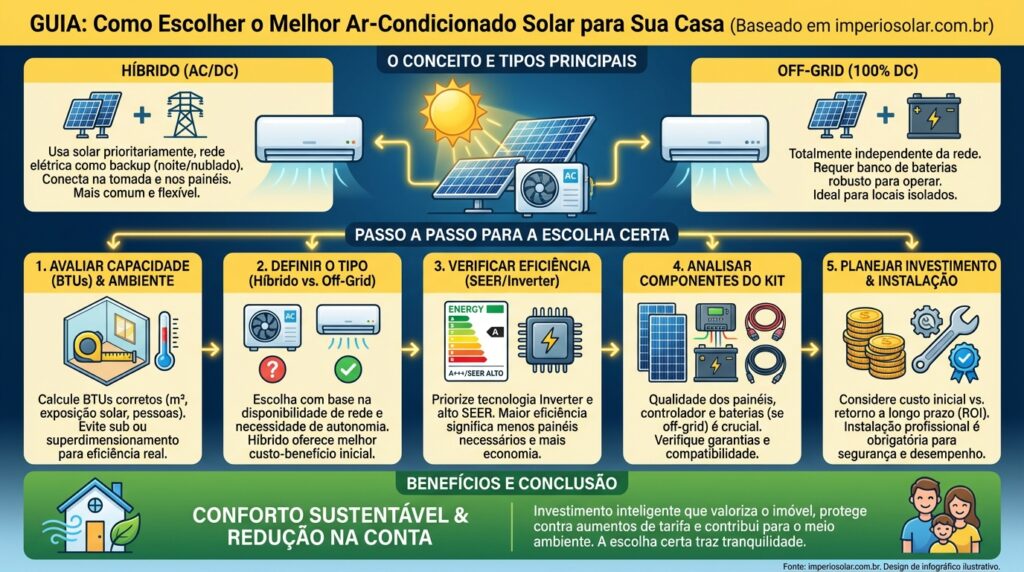 Priorize marcas confiáveis e com forte reputação em tecnologia solar, não apenas as tradicionais de HVAC. Pesquise a confiabilidade e a tecnologia específica do produto.